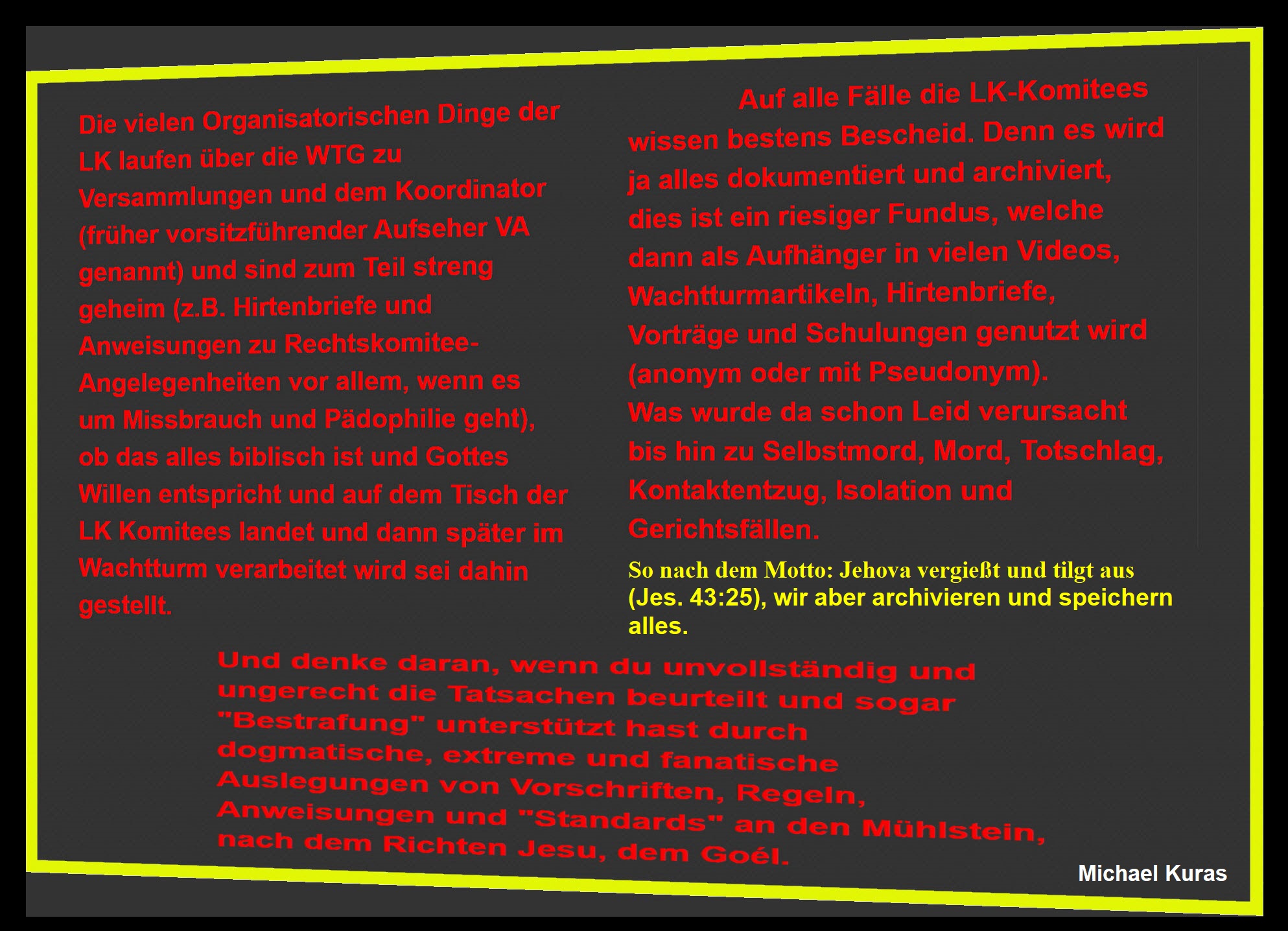 Die Organisation benutzt den Namen Gottes für ihre eigenen Interessen und betrügt und belügt die Leser und manipuliert so laufend (Joh. 8:44-47). In Epheser 4:15 geht es um Jesus Christus - siehe diesen Tagestext – ich zitiere: